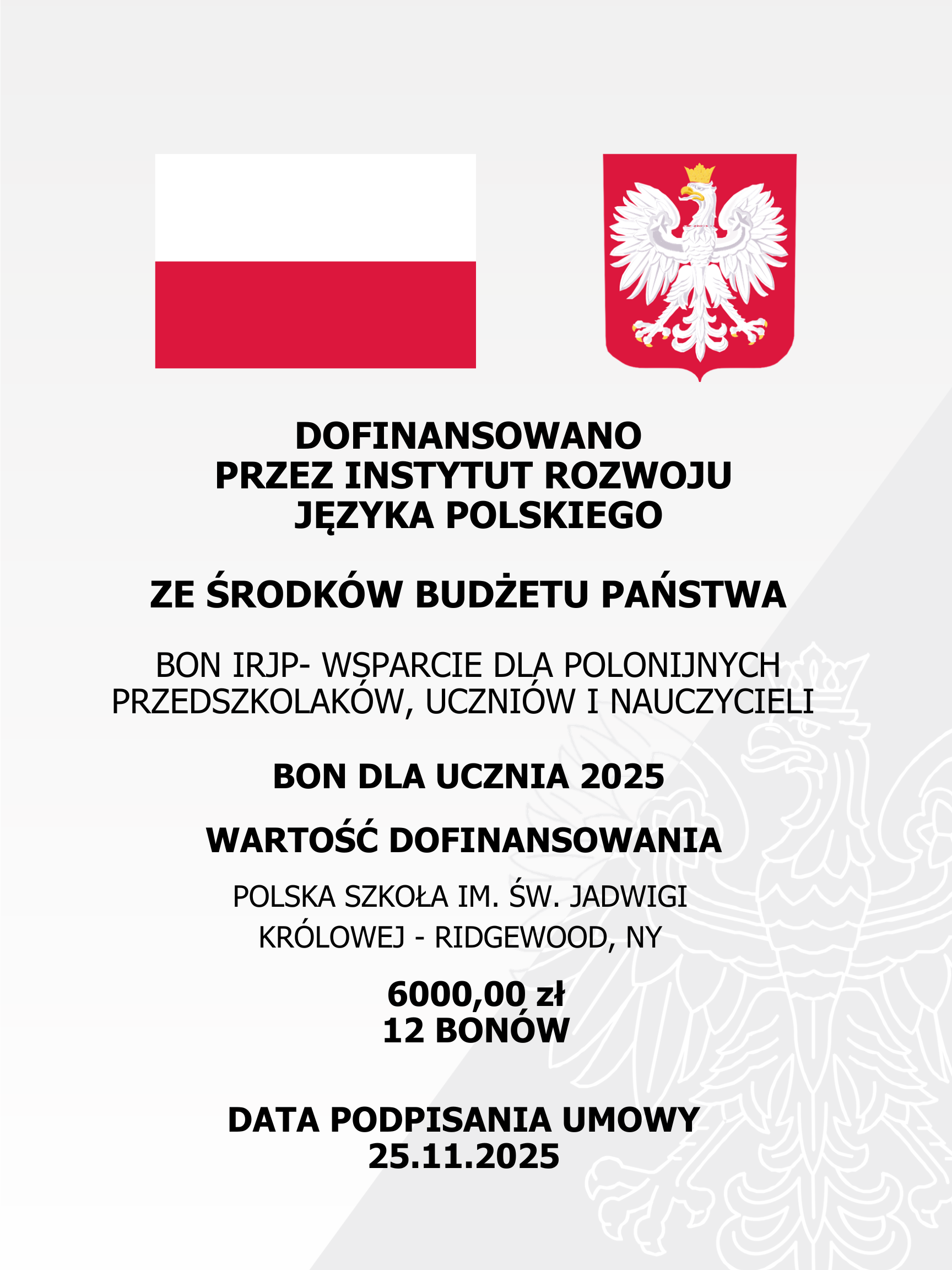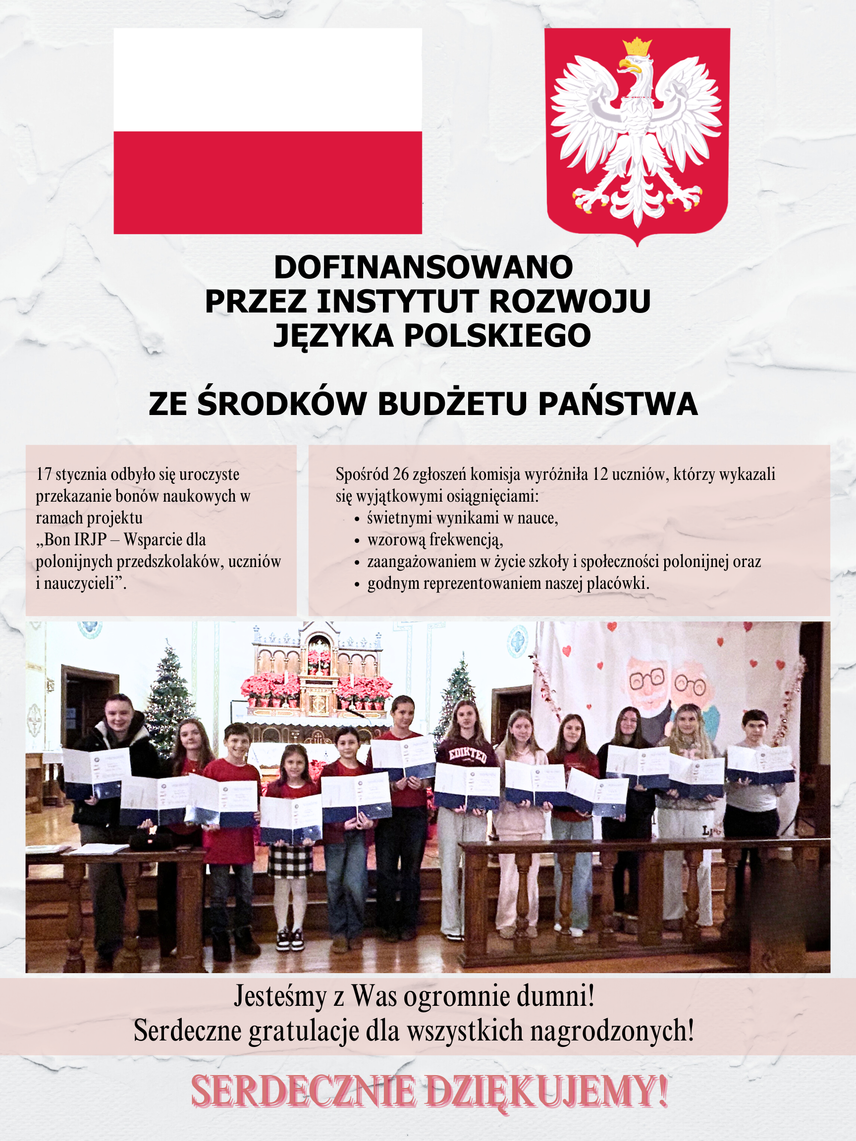 Bon Ucznia 2025 – 17 stycznia odbyło się uroczyste przekazanie bonów naukowych w ramach projektu „Bon IRJP – Wsparcie dla polonijnych przedszkolaków, uczniów i nauczycieli”. Bony otrzymało 12 uczniów. Gratulujemy wszystkim nagrodzonym!