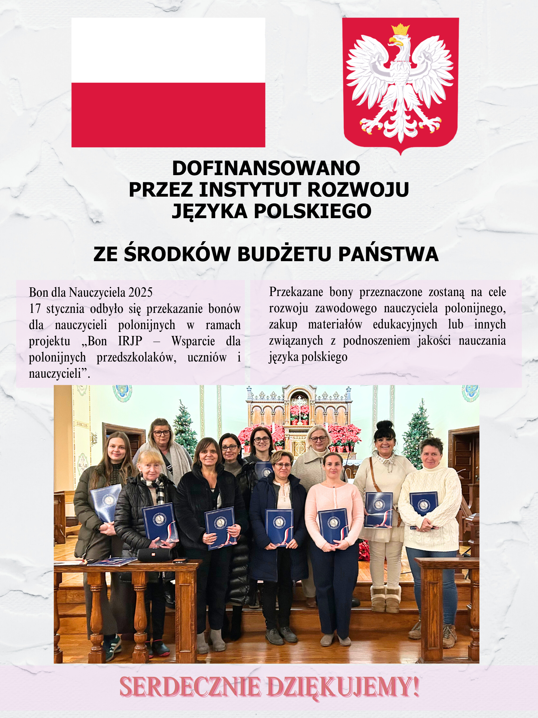 Składamy bardzo serdeczne podziękowanie Instytutowi Rozwoju Języka Polskiego im. Świętego Maksymiliana Marii Kolbego za bony dla 11 nauczycieli w ramach projektu „BON NAUCZYCIELA”. Dziękujemy Fundacji Pomoc Polakom na Wschodzie im. J. Olszewskiego oraz CPSD.