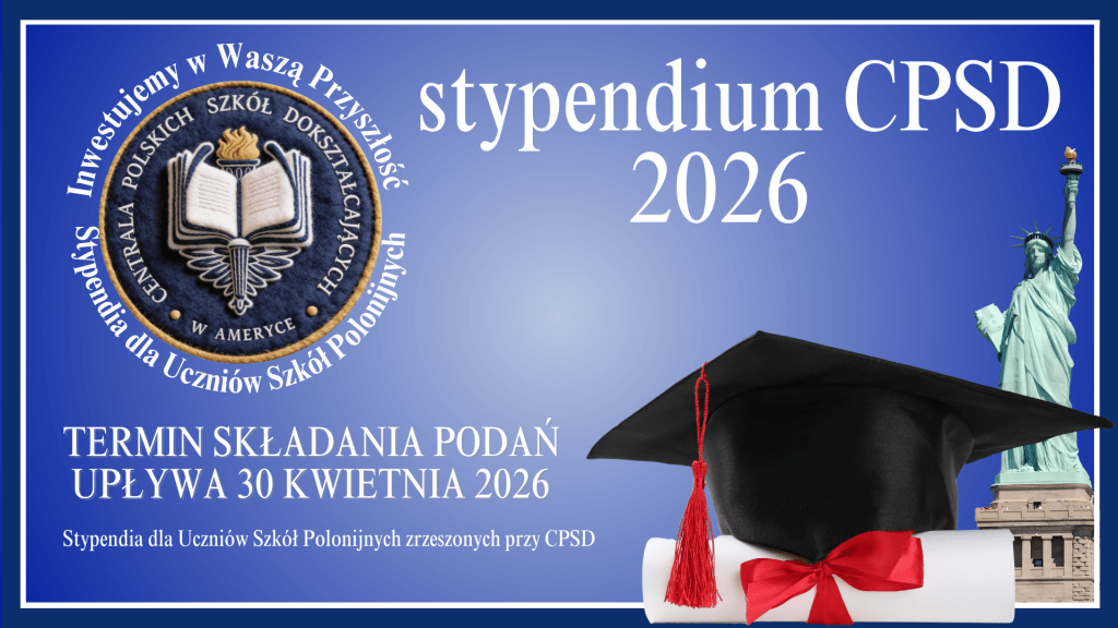 Stypendium CPSD adresowane jest do uczniów, którzy w przyszłym roku szkolnym 2026/27 rozpoczną naukę w College’u lub Uniwersytecie (są przed pierwszym rokiem studiów). O stypendium mogą ubiegać się uczniowie, którzy kończą w tym roku swoje amerykańskie HS i jednocześnie kończą naszą polską szkołę (tegoroczni maturzyści) oraz ubiegłoroczni absolwenci naszego polonijnego liceum. Informacje o STYPENDIUM CPSD 2026 oraz o innych dostępne są w zakładce STYPENDIUM DLA MATURZYSTY . Natomiast poster poniżej przekierowuje na stronę CPSD.