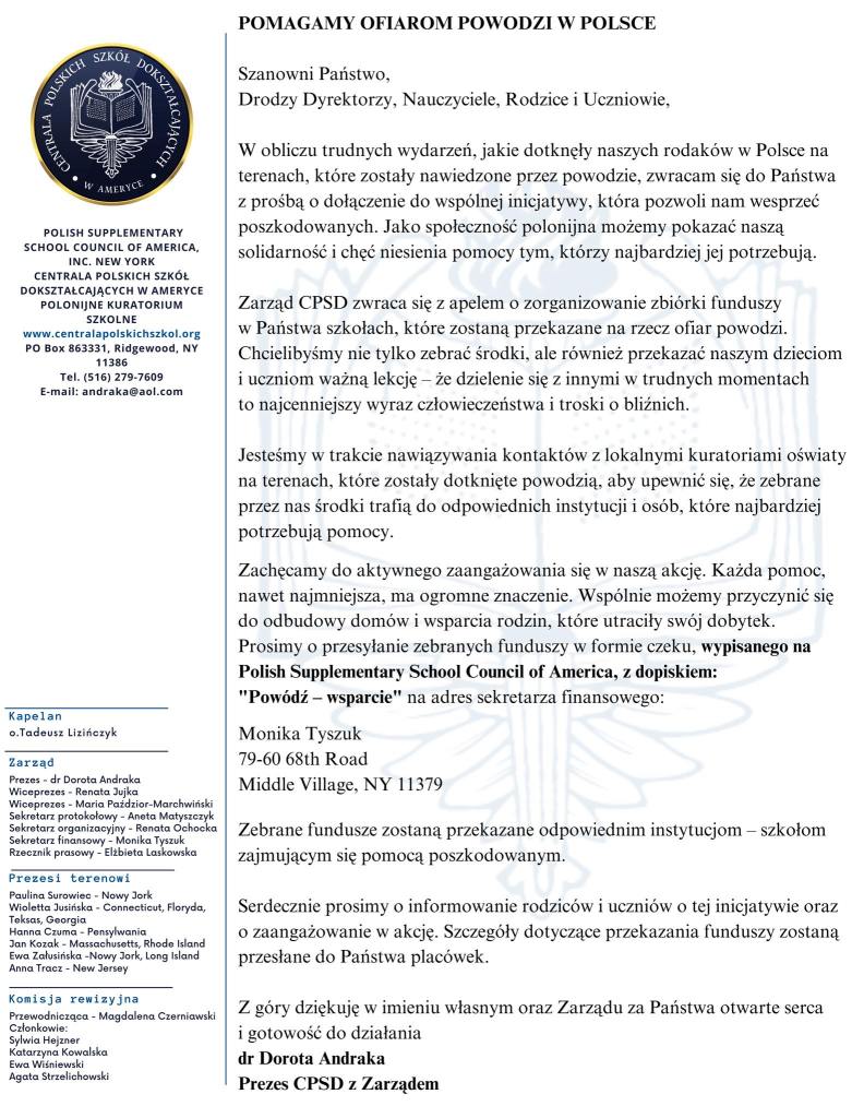 POMOC DLA OFIAR POWODZI W POLSCE 19 Thursday Sep 2024 Posted by polskaszkolajk in Uncategorized ≈ Leave a comment Zbiórkę w naszej szkole przeprowadzimy w soboty 21 i 28 września. Ofiarowdawców prosimy o wpisanie się na listę u dyrektora. Zebraną wpólnie kwotę przekażemy do CPSD. Z góry dziękujemy za pomoc. Share this: Click to share on X (Opens in new window) X Click to share on Facebook (Opens in new window) Facebook Like Loading... Related