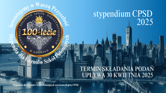 Stypendium CPSD adresowane jest do uczniów, którzy w przyszłym roku szkolnym 2025/26 rozpoczną naukę w College’u lub Uniwersytecie (są przed pierwszym rokiem studiów). O stypendium mogą ubiegać się uczniowie, którzy kończą w tym roku swoje amerykańskie HS i jednocześnie kończą naszą polską szkołę (tegoroczni maturzyści) oraz ubiegłoroczni absolwenci naszego polonijnego liceum. Informacje o STYPENDIUM CPSD 2025 oraz o innych dostępne są w zakładce STYPENDIUM DLA MATURZYSTY . Natomiast poster poniżej przekierowuje na stronę CPSD.