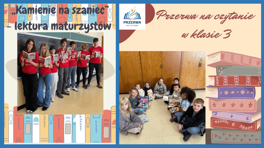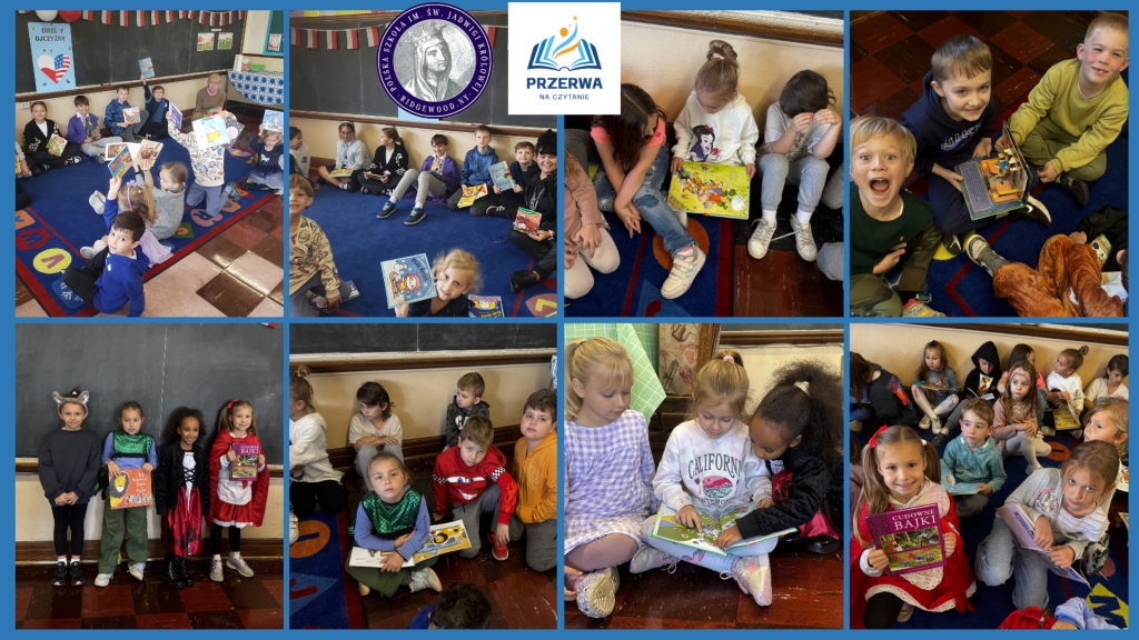 28.10.2023 r. wszyscy uczniowie Polskiej Szkoły im. Św. Jadwigi Królowej z klas 0-11 wraz wychowawcami wzięli udział w IV MIĘDZYNARODOWEJ EDYCJI VIII OGÓLNOPOLSKIEJ AKCJI „PRZERWA NA CZYTANIE – BICIE REKORDU W CZYTANIU NA PRZERWIE”. Promujemy czytanie jako wartościową formę spedzania czasu oraz formę ulepszania i pogłębiania umiejętności językowych. Najmłodszym uczniom książki czytali nauczyciele. W starszych klasach uczniowie czytali samodzielnie lub w grupach.