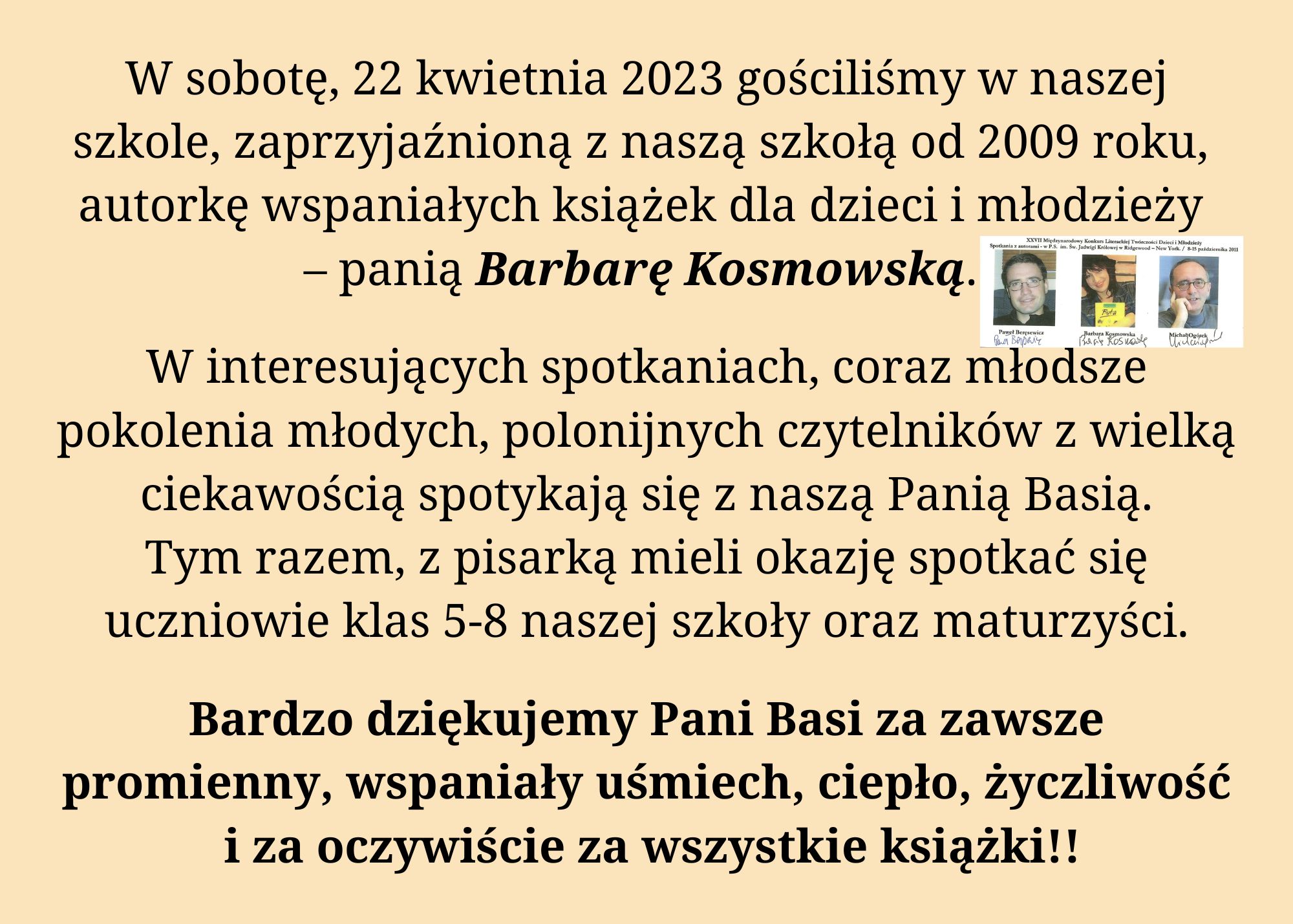 22 kwietnia 2023 – SPOTKANIE AUTORSKIE Z PISARKĄ – P. BARBARA KOSMOWSKA